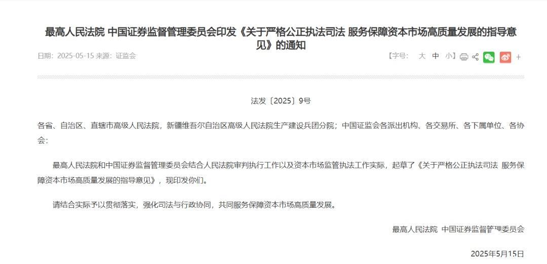 5月15日,最高人民法院和中国证券监督管理委员会结合人民法院审判执行工作以及资本市场监管执法工作实际,起草了《关于严格公正执法司法 服务保障资本市场高质量发展的指导意见》(以下简称“指导意见”)。